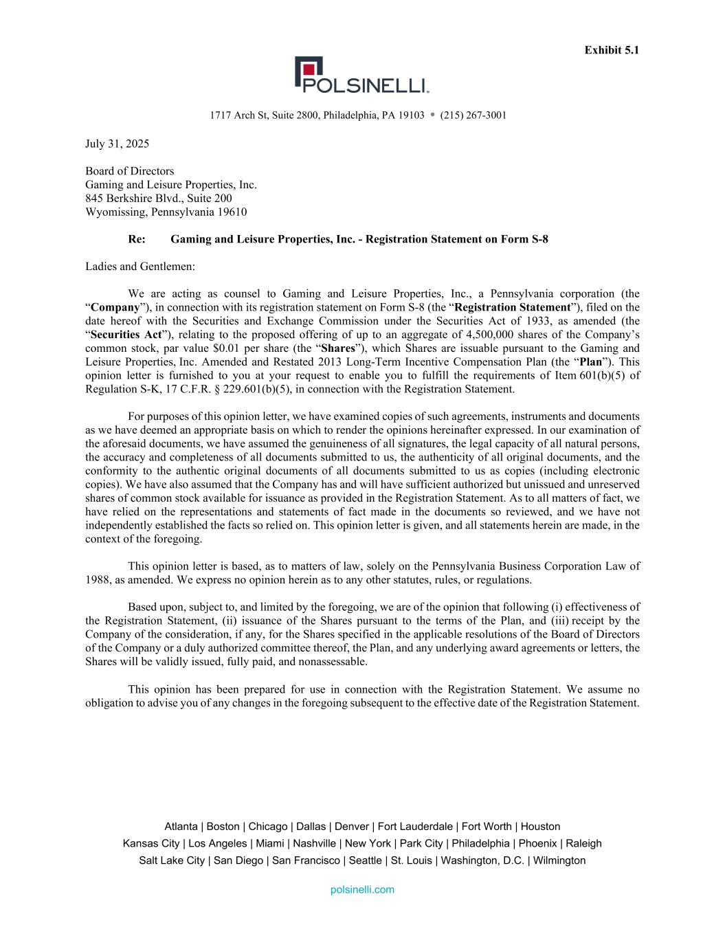 Exhibit 5.1 1717 Arch St, Suite 2800, Philadelphia, PA 19103 • (215) 267-3001 Atlanta | Boston | Chicago | Dallas | Denver | Fort Lauderdale | Fort Worth | Houston Kansas City | Los Angeles | Miami | Nashville | New York | Park City | Philadelphia | Phoenix | Raleigh Salt Lake City | San Diego | San Francisco | Seattle | St. Louis | Washington, D.C. | Wilmington polsinelli.com July 31, 2025 Board of Directors Gaming and Leisure Properties, Inc. 845 Berkshire Blvd., Suite 200 Wyomissing, Pennsylvania 19610 Re: Gaming and Leisure Properties, Inc. - Registration Statement on Form S-8 Ladies and Gentlemen: We are acting as counsel to Gaming and Leisure Properties, Inc., a Pennsylvania corporation (the “Company”), in connection with its registration statement on Form S-8 (the “Registration Statement”), filed on the date hereof with the Securities and Exchange Commission under the Securities Act of 1933, as amended (the “Securities Act”), relating to the proposed offering of up to an aggregate of 4,500,000 shares of the Company’s common stock, par value $0.01 per share (the “Shares”), which Shares are issuable pursuant to the Gaming and Leisure Properties, Inc. Amended and Restated 2013 Long-Term Incentive Compensation Plan (the “Plan”). This opinion letter is furnished to you at your request to enable you to fulfill the requirements of Item 601(b)(5) of Regulation S-K, 17 C.F.R. § 229.601(b)(5), in connection with the Registration Statement. For purposes of this opinion letter, we have examined copies of such agreements, instruments and documents as we have deemed an appropriate basis on which to render the opinions hereinafter expressed. In our examination of the aforesaid documents, we have assumed the genuineness of all signatures, the legal capacity of all natural persons, the accuracy and completeness of all documents submitted to us, the authenticity of all original documents, and the conformity to the authentic original documents of all documents submitted to us as copies (including electronic copies). We have also assumed that the Company has and will have sufficient authorized but unissued and unreserved shares of common stock available for issuance as provided in the Registration Statement. As to all matters of fact, we have relied on the representations and statements of fact made in the documents so reviewed, and we have not independently established the facts so relied on. This opinion letter is given, and all statements herein are made, in the context of the foregoing. This opinion letter is based, as to matters of law, solely on the Pennsylvania Business Corporation Law of 1988, as amended. We express no opinion herein as to any other statutes, rules, or regulations. Based upon, subject to, and limited by the foregoing, we are of the opinion that following (i) effectiveness of the Registration Statement, (ii) issuance of the Shares pursuant to the terms of the Plan, and (iii) receipt by the Company of the consideration, if any, for the Shares specified in the applicable resolutions of the Board of Directors of the Company or a duly authorized committee thereof, the Plan, and any underlying award agreements or letters, the Shares will be validly issued, fully paid, and nonassessable. This opinion has been prepared for use in connection with the Registration Statement. We assume no obligation to advise you of any changes in the foregoing subsequent to the effective date of the Registration Statement.