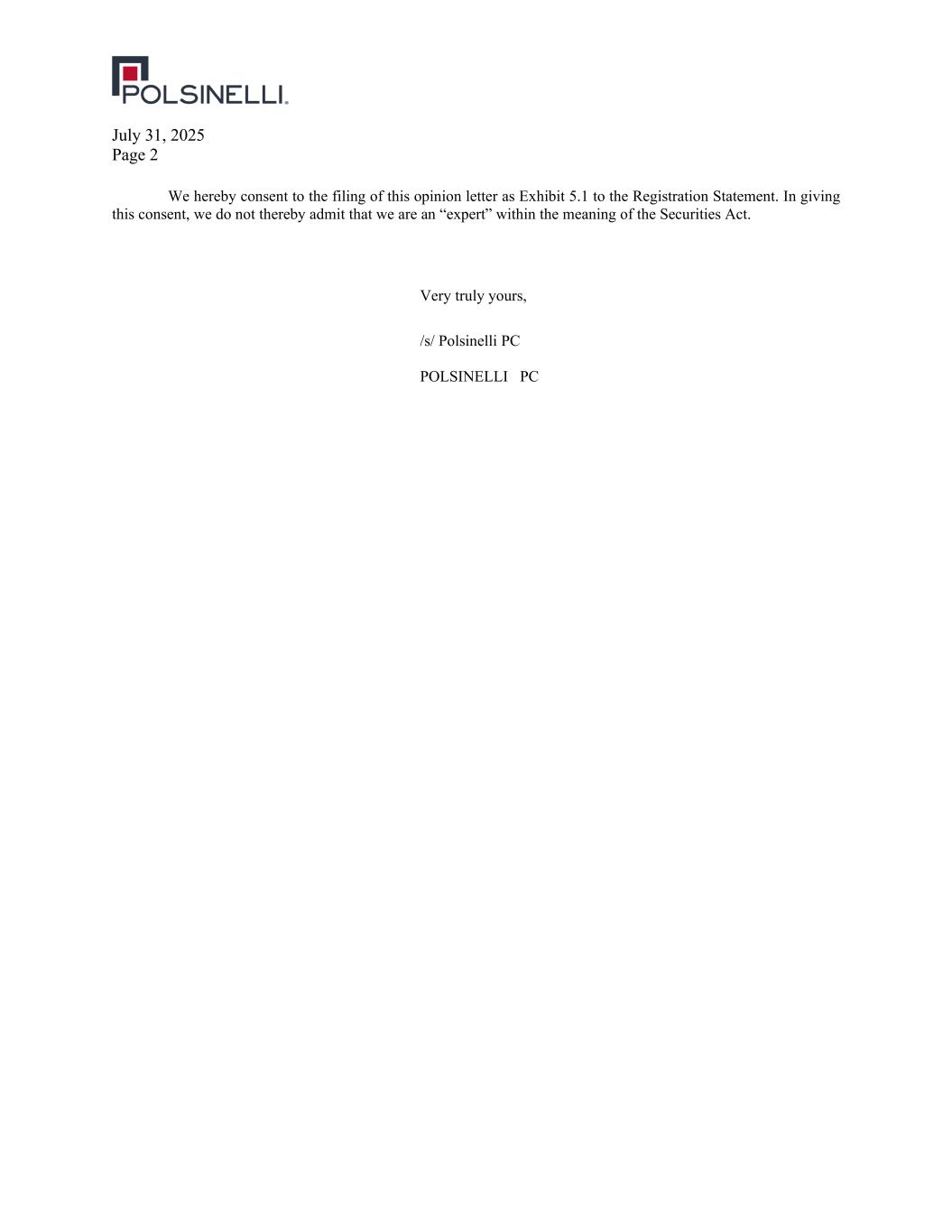 July 31, 2025 Page 2 We hereby consent to the filing of this opinion letter as Exhibit 5.1 to the Registration Statement. In giving this consent, we do not thereby admit that we are an “expert” within the meaning of the Securities Act. Very truly yours, /s/ Polsinelli PC POLSINELLI PC